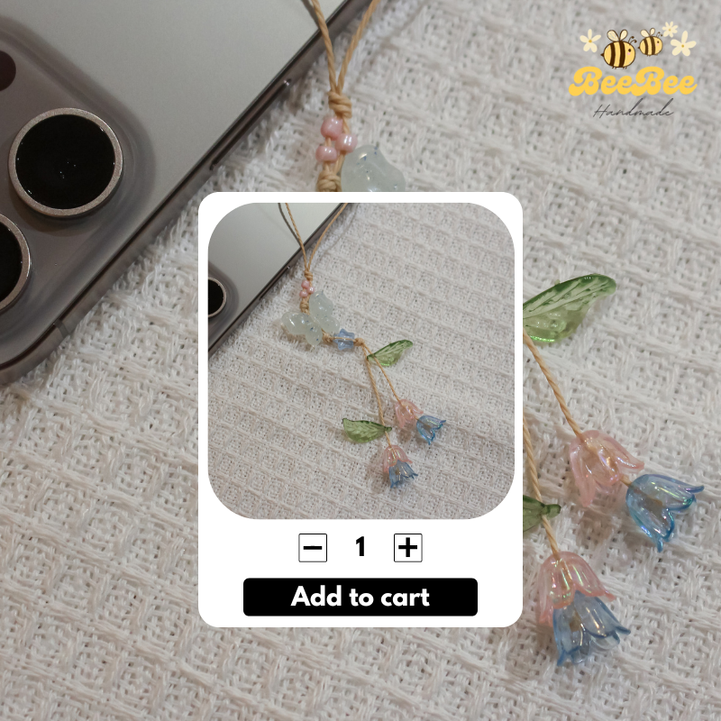 Dây đeo điện thoại nổi bật với những bông hoa nhỏ xinh như chuông thủy tinh, được tạo hình tỉ mỉ từ resin trong suốt, mang sắc hồng dịu dàng và xanh pastel mộng mơ. Mỗi chi tiết đều mang đậm dấu ấn thủ công nghệ thuật, tạo nên phong cách thanh thoát cho người sử dụng.