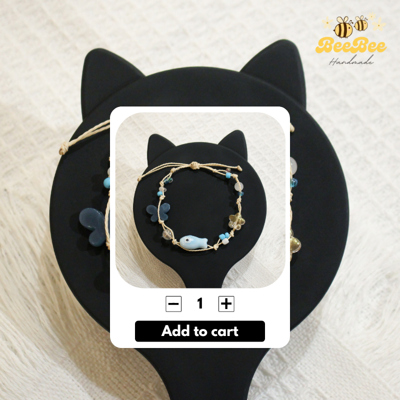 Sản phẩm là sự kết hợp giữa các chi tiết thủ công tinh xảo: hạt cá màu xanh trời, cánh bướm xanh biển, hoa trong suốt, tất cả được xâu trên dây sáp tự nhiên. Mang lại cảm giác vui tươi, độc đáo và đậm chất “BeeBee”.